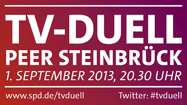 Am 1. September ist es soweit! Drei Wochen vor der Bundestagswahl findet das TV-Duell zwischen Peer Steinbrück und Angela Merkel statt. Das neunzigminütige Duell wird aus dem Studio Berlin-Adlershof live übertragen. Die SPD Speyer zeigt das TV-Duell als Public Viewing im Hotel Löwengarten, Schwerdstr. 14, ab 20 Uhr. Um 20.15 beginnt die Übertragung, um 20.30 Uhr startet das TV-Duell. die Fragen stellen die Moderationspaare Anne Will (ARD) / Stefan Raab (ProSieben) sowie Maybrit Illner (ZDF) / Peter Kloeppel (RTL).