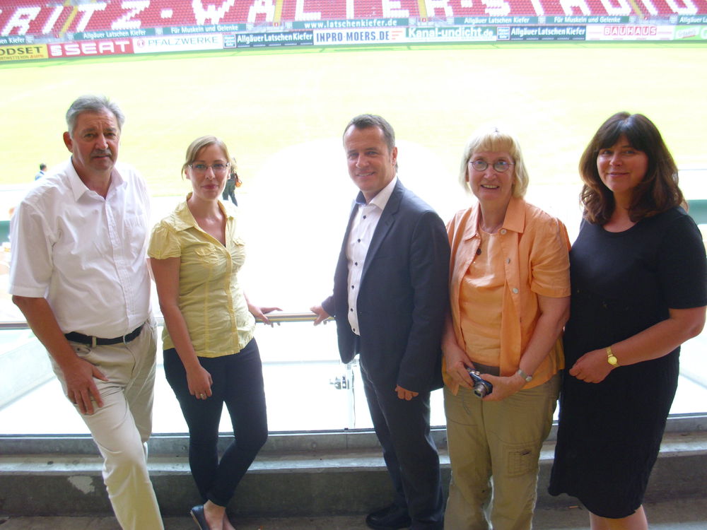 (v.l.n.r.) Karl-Heinz Weinmann, Stefanie Seiler, Jens Guth und außen Jutta Steinruck auf den Stufen der FCK Tribüne.Zu einer SPD Ortsvereins-Konferenz hatte der SPD -Landesverband in das Tagungszentrum des 1. FC Kaiserslautern eingeladen, zu der mehr als 70 Mandats- und Funktionsträger der Partei gekommen waren. Dazu konnte der SPD Generalsekretär Jens Guth auch die Vorsitzende des rheinland-pfälzischen Parteirates Jutta Steinruck begrüßen.